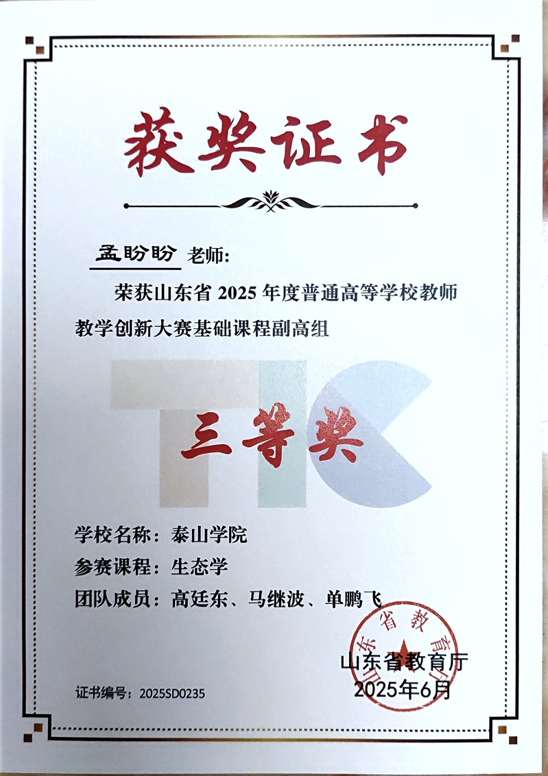 近日,山东省教育厅公布第五届教师教学创新大赛获奖名单,我院孟盼盼老师及其教学团队精心打造的《生态学》课程凭借前瞻的教学理念与扎实的创新实践,在全省众多优秀参赛作品中脱颖而出,喜获三等奖。