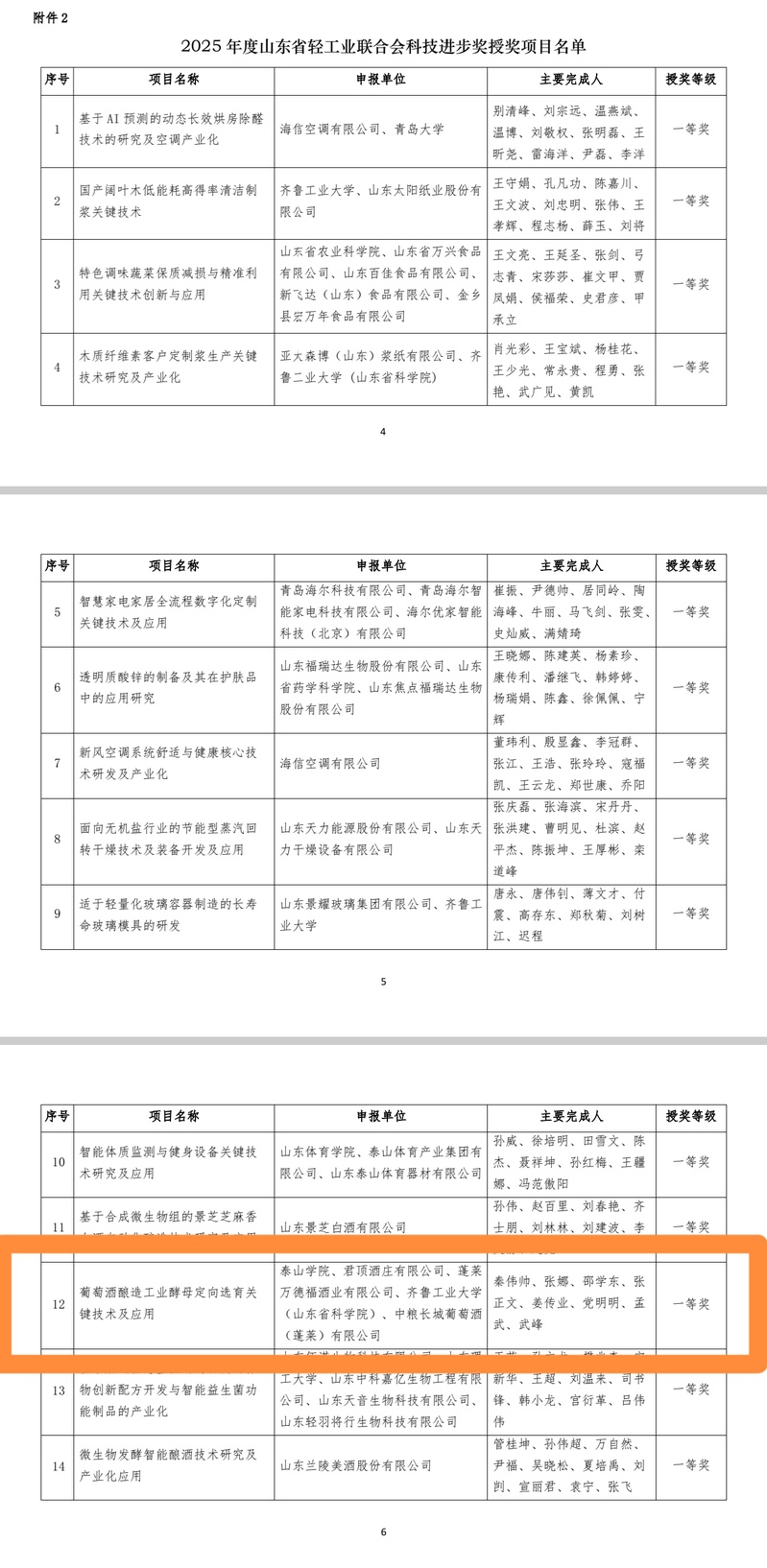 近日,山东省轻工业联合会发布2025年度科学技术奖励决定,由泰山学院牵头,联合中粮长城葡萄酒(蓬莱)有限公司、君顶酒庄有限公司、蓬莱万德福酒业有限公司、齐鲁工业大学(山东省科学院)共同完成的“葡萄酒酿造工业酵母定向选育关键技术及应用”项目,荣获山东省轻工业联合会科技进步奖一等奖。该项目由生物与酿酒工程学院秦伟帅博士主持,标志着其在酿酒微生物技术与工艺创新领域的研究取得重要突破,体现了该技术在产品化应用中的成熟度与市场竞争力,也展现了山东省在果酒与烈酒品类中的创新实力与品质高度。
